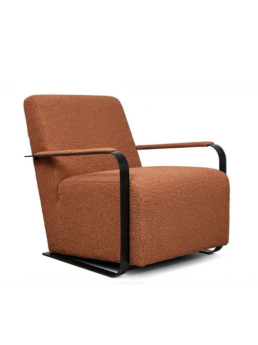 Fully upholstered in bouclé fabric, the armchair offers a warm, tactile seating experience. The contrast of rose gold metal details adds a subtle sense of luxury while preserving a clean, contemporary expression.