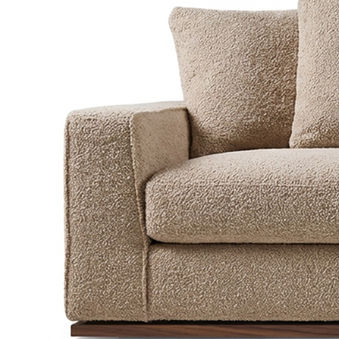 The generous cushions, upholstered in tactile bouclé fabric, create an inviting surface that encourages relaxation. Beneath the softness, the structured base provides stability and visual grounding, allowing the design to feel both light and substantial at the same time.