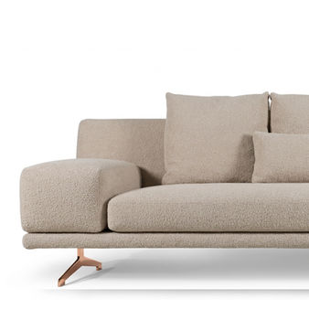 Fully upholstered in bouclé fabric, the sofa offers a soft, tactile feel with a calm and refined character. The contrast of slender metal legs in a glossy rose gold finish adds lightness and a subtle touch of luxury, elevating the overall design without overpowering its simplicity.